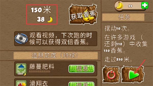 4、當(dāng)前進(jìn)度為【150-米】【38-香蕉】,可觀看視頻獲取【雙倍香蕉】增益,同時(shí)推進(jìn)【收集150-香蕉】的任務(wù)目標(biāo)。