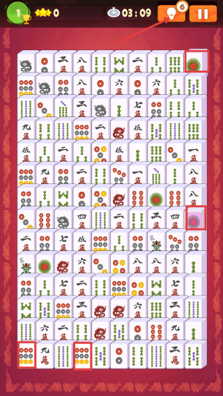 2、在麻將堆中尋找相同圖案的麻將,點(diǎn)擊進(jìn)行配對(duì)消除,若有困難可使用右上角提示功能。