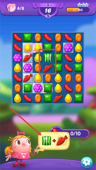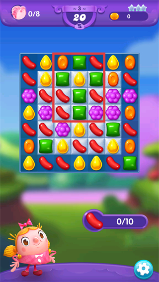 2、在糖果網格中,消除紅色框內的糖果,完成【0/10】紅色糖果的消除目標。
