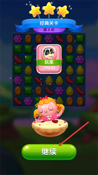 4、關卡完成后,點擊【繼續】按鈕,進入下一個糖果消除關卡繼續挑戰。