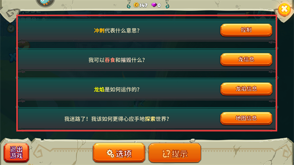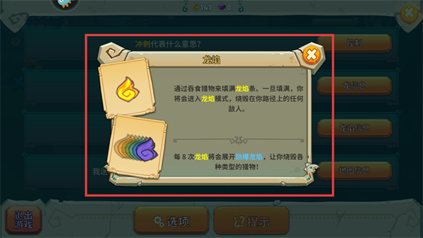 1、遇到基礎玩法疑問時,可點擊對應按鈕查看【沖刺】【龍焰】【地圖】等功能說明,快速熟悉游戲核心機制。