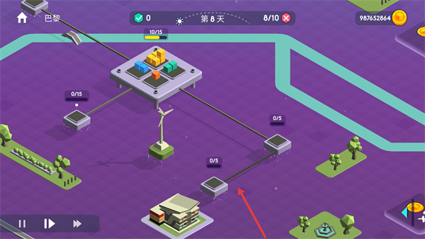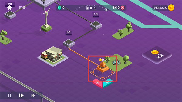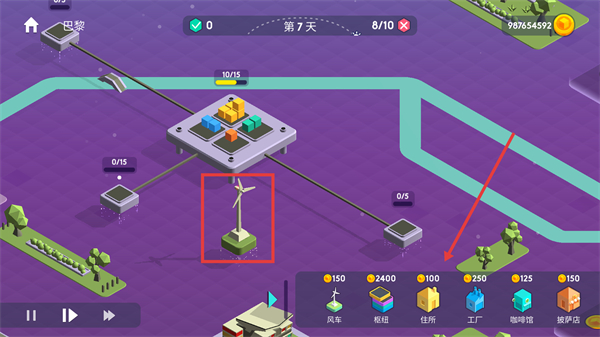 1、巴黎場景,紅色框標【風車】建筑,右側顯示各建筑造價,箭頭指向右側資源區。
