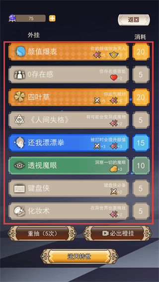 1、開局抽取轉生天賦不滿意可重抽,完成基礎設定生成角色屬性,點擊屏幕推進劇情開啟異界人生。