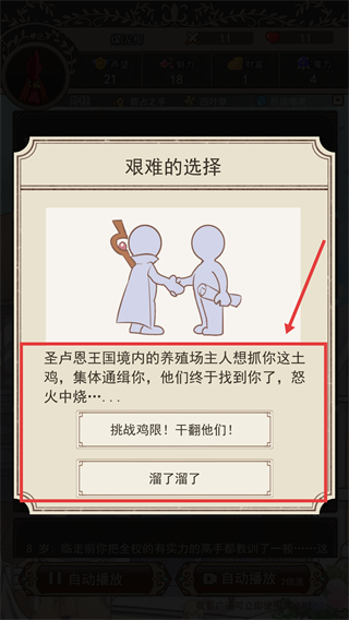4、根據角色屬性選劇情選項,勇氣高選挑戰雞梗提升經驗,勇氣低選溜了避免失敗影響后續走向。