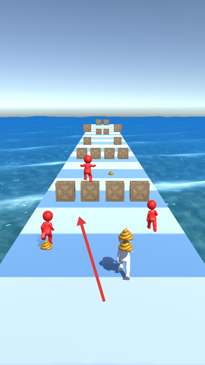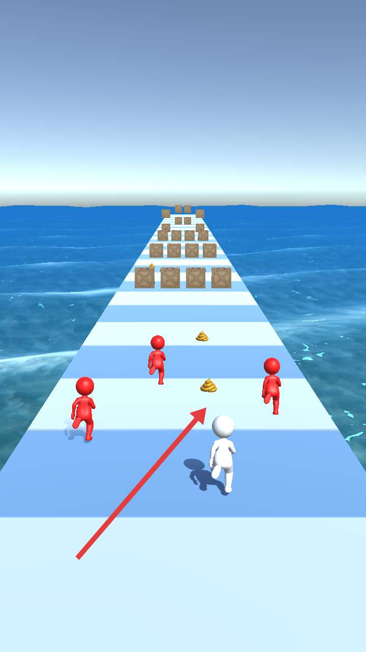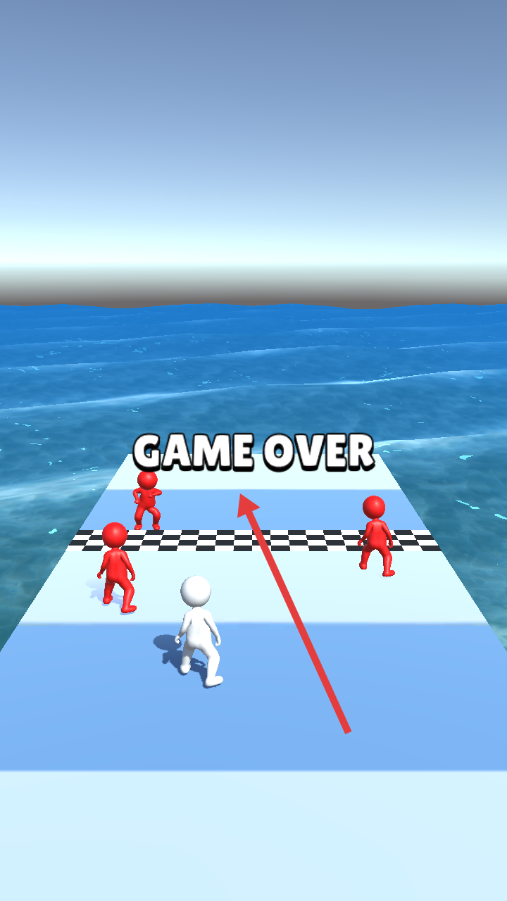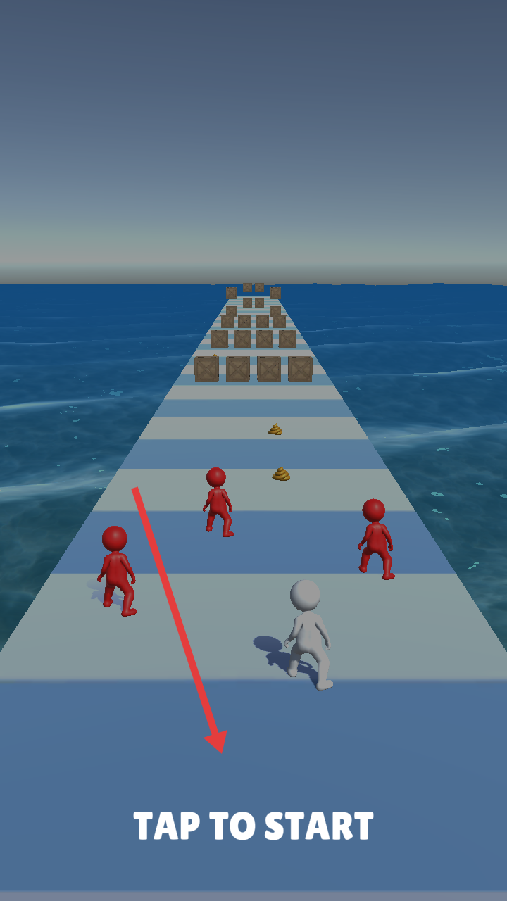 1、點擊TAPTOSTART,操控白色角色在海上賽道開始游戲,需躲避紅色角色和障礙物。