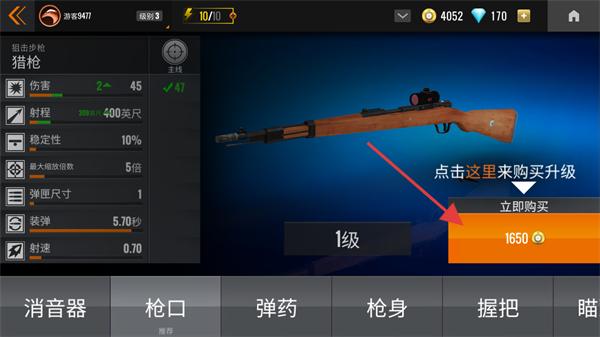 1、在武器界面,點擊【立即購買】按鈕,消耗【1650-金幣】可升級【獵槍-槍口】等部件。