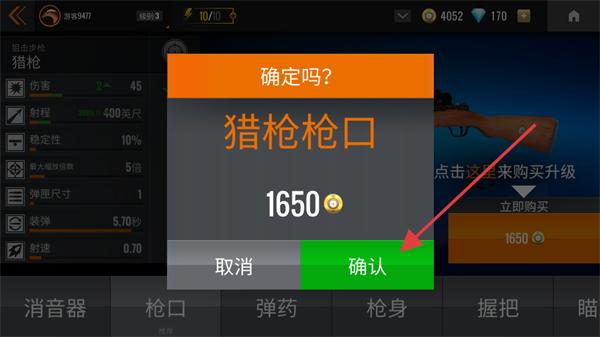2、彈出【確定嗎?】彈窗,確認消耗【1650-金幣】升級【獵槍槍口】,點擊【確認】完成操作。
