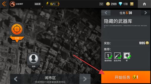 3、消耗【1-點能量】點擊【開始任務】按鈕,接取【隱藏的武器庫】任務,準備執行狙擊挑戰。