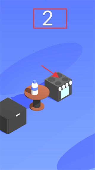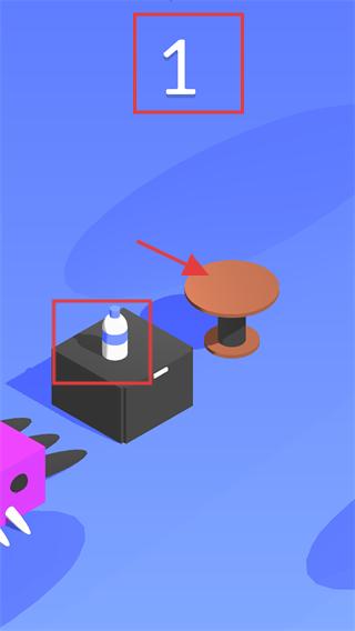 3、瓶子成功落到黑色平臺后,上方出現(xiàn)【1】的得分,繼續(xù)點擊屏幕讓瓶子向棕色圓臺跳躍。