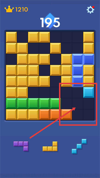 1、觀察界面中【藍色方塊】的位置,合理放置它來消除右側【黃色方塊】區域,同時注意底部方塊的堆疊情況。