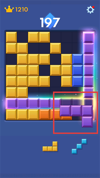 3、放置【紫色方塊】時,利用其特殊消除效果清理多列方塊,快速提升分數至【197】,保持界面整潔。