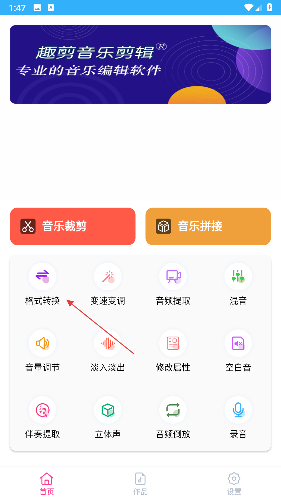 1、在趣剪音樂剪輯首頁,點擊【格式轉換】,進入格式轉換頁面。