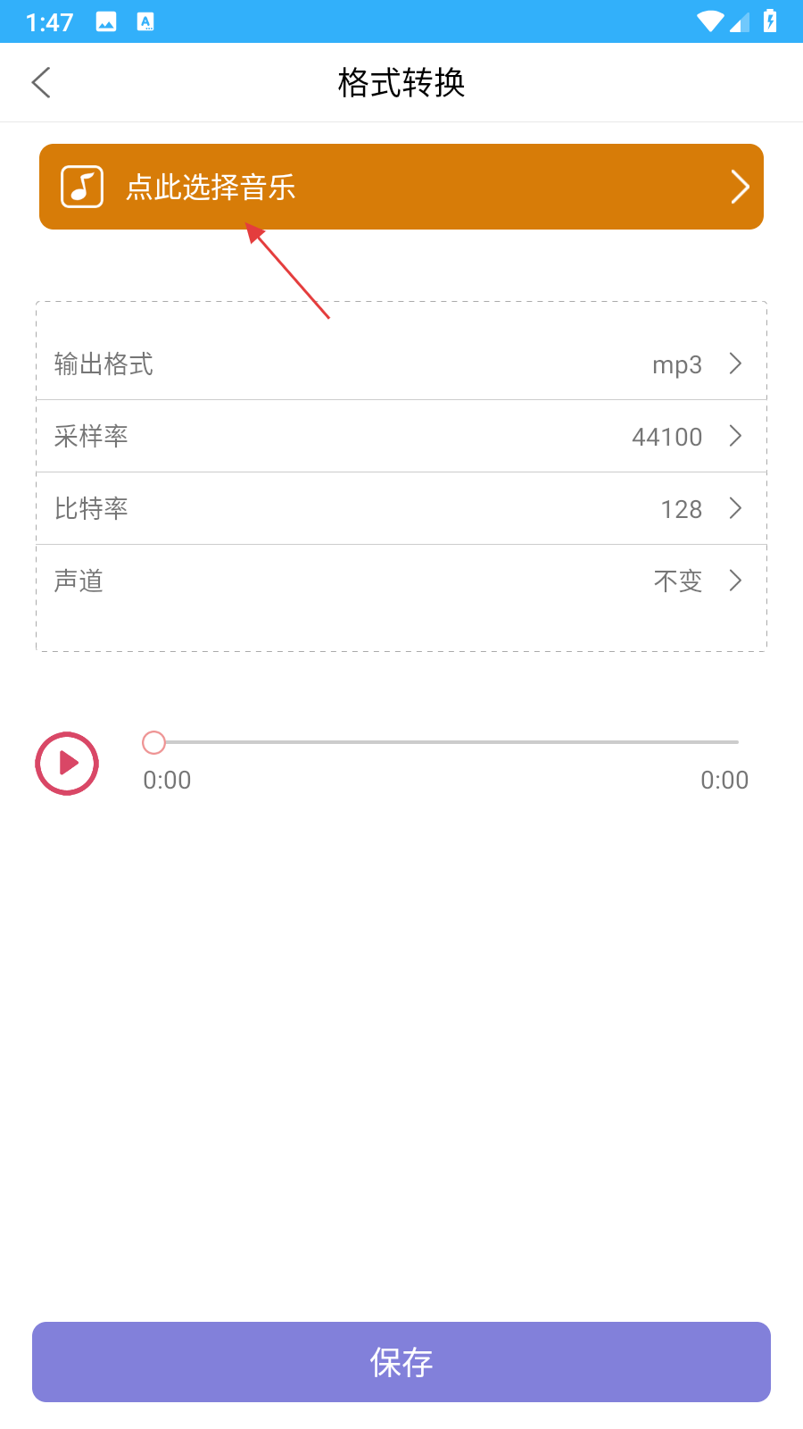 2、在格式轉換頁面,點擊【點此選擇音樂】,進入本地媒體庫。