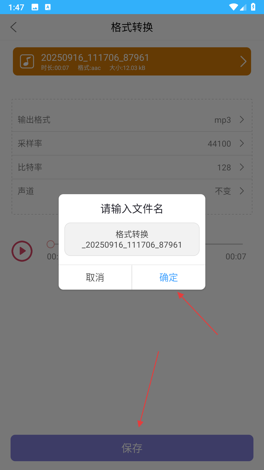 4、選好音樂設置完成后,點擊【保存】,彈出的輸入文件名窗口,點擊【確定】,即可完成格式轉換操作。