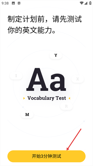 2、進入英文能力測試頁面,點擊【開始3分鐘測試】按鈕,參與詞匯量測試。
