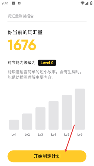 4、查看詞匯量測試報告后,點擊【開始制定計劃】按鈕,基于測試得出的能力等級,規劃適配的學習計劃。