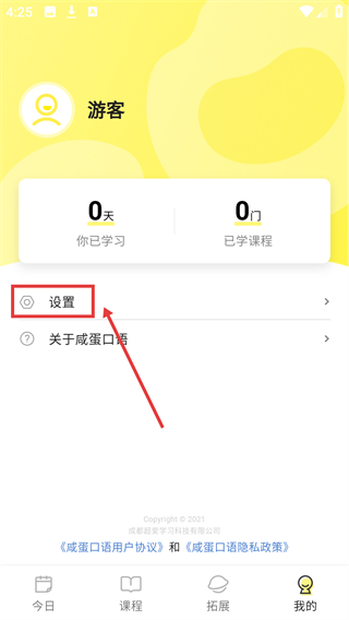 2、在個人中心頁面,看到【游客】身份及學習數據,找到【設置】選項并點擊,進入功能設置頁面。