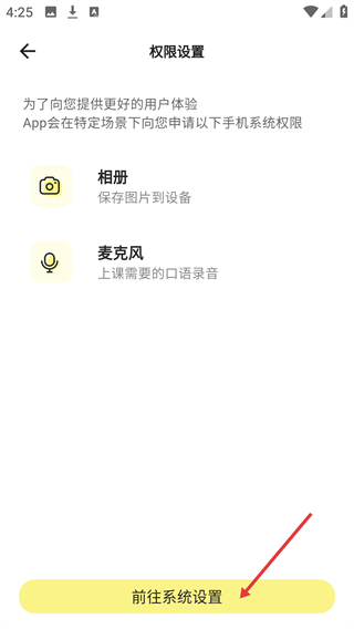 4、進入【權限設置】頁面后,查看【相冊】【麥克風】的權限說明,點擊【前往系統設置】進行權限配置。
