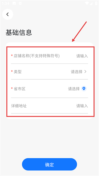 3、填寫“店鋪名稱”、“店鋪類型”、“省市區”和“詳細地址”等信息。