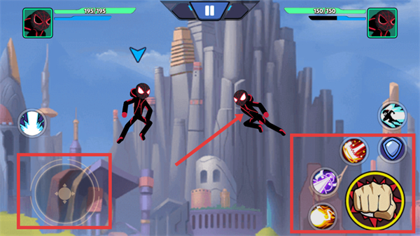 2、通過左側紅框內的方向鍵調整位置,利用右側技能與拳頭按鈕,瞄準敵方角色發起攻擊。