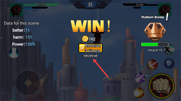 4、戰斗勝利后,點擊【Receive】領取【162-金幣】等獎勵,完成本局對戰的資源結算。
