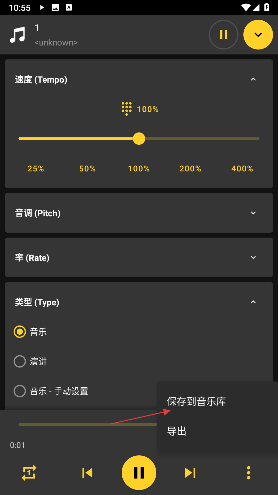 3、在彈出的操作選項中,點擊【保存到音樂庫】,彈出保存設置窗口。