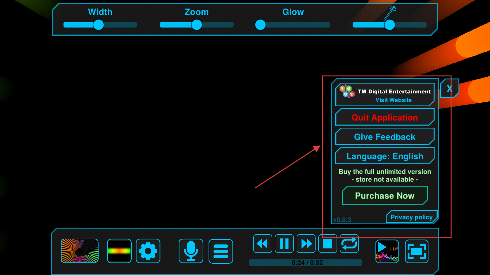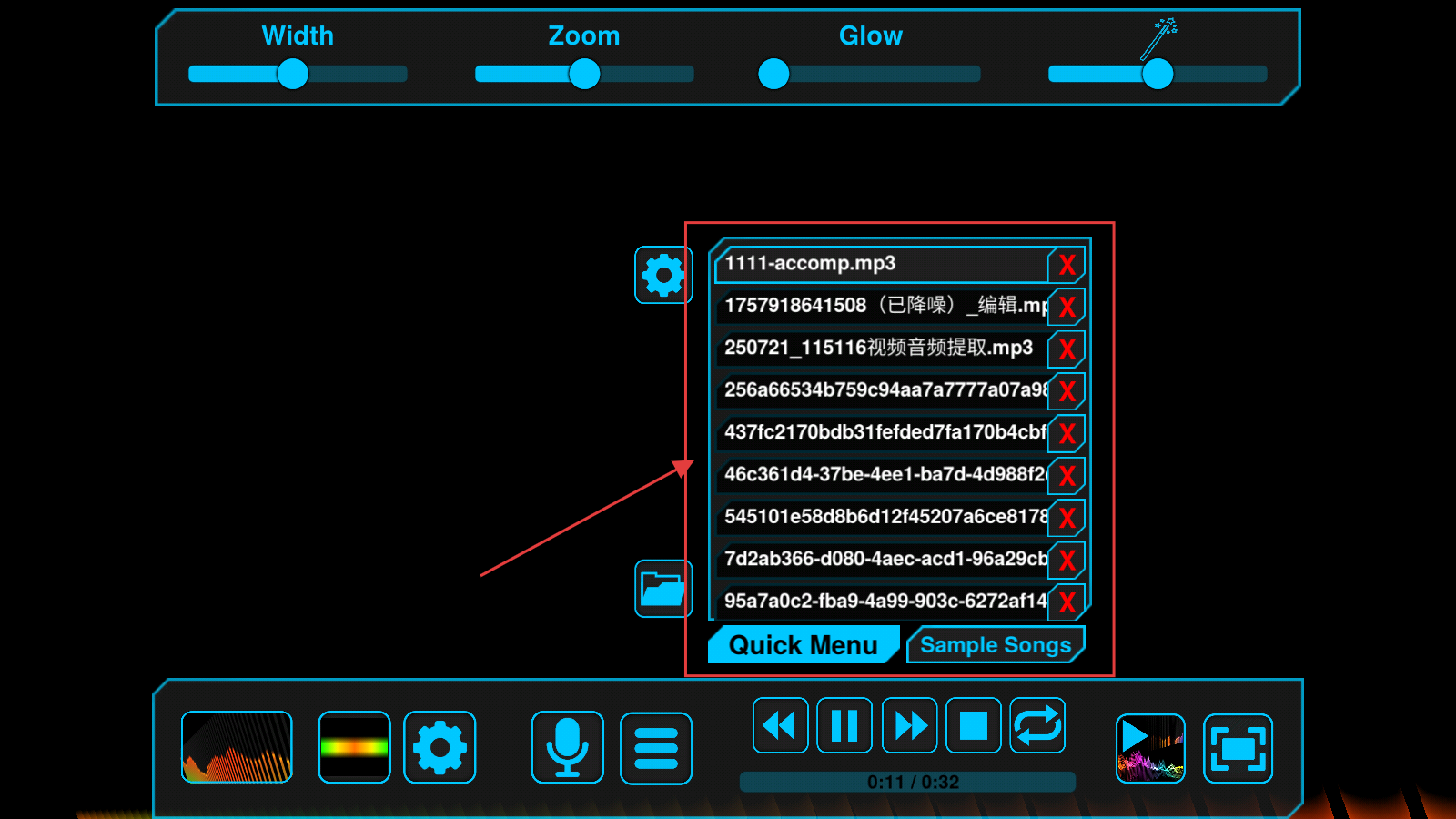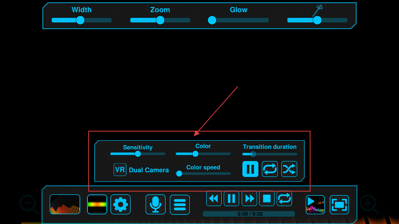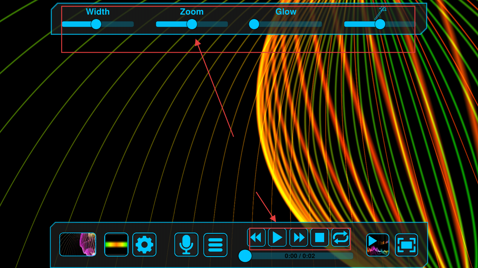 1、在主界面,可調節【Width、Zoom、Glow】等參數,還能【進行播放、暫停】等操作,打造專屬視覺與音頻效果。