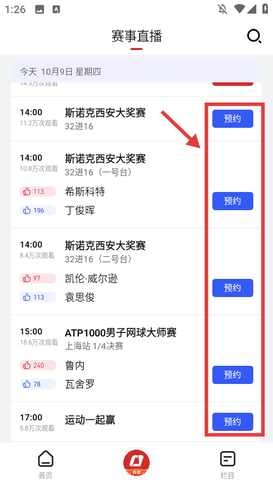 1、在賽事直播頁面,找到想預(yù)約的賽事,點(diǎn)擊賽事右側(cè)的【預(yù)約】按鈕。