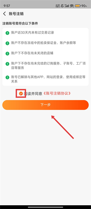4、確認符合所有注銷條件后,勾選【閱讀并同意】,再點擊下一步,就能繼續完成注銷啦。