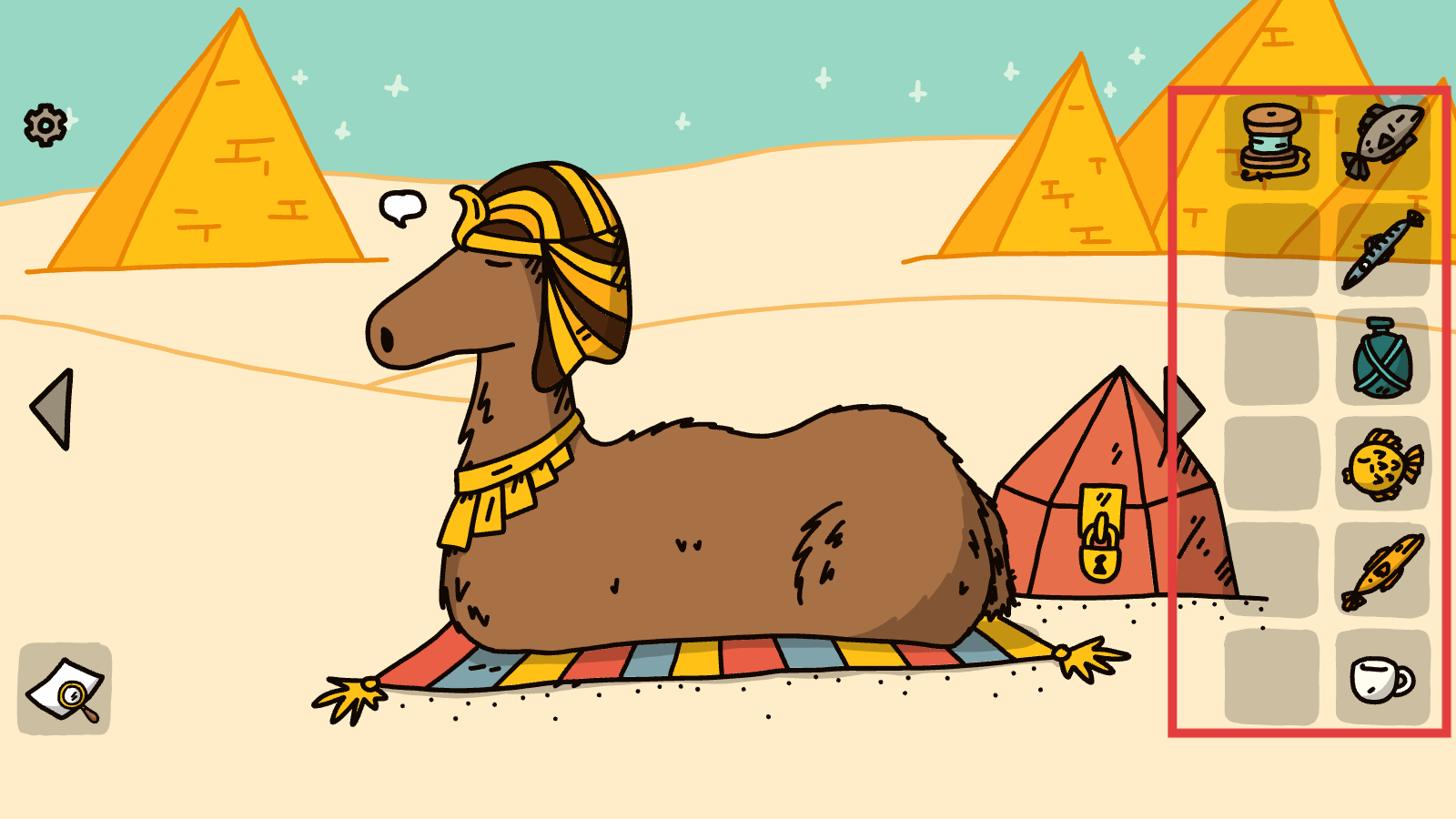 4、查看右側物品欄,了解可用物品,與駱駝等元素互動,在場景中找出物品推進游戲。