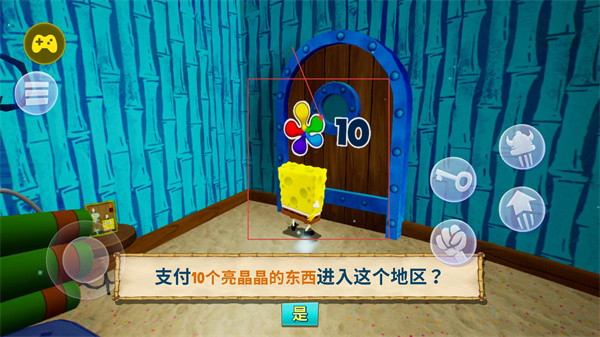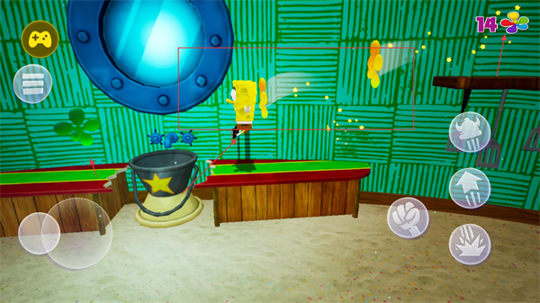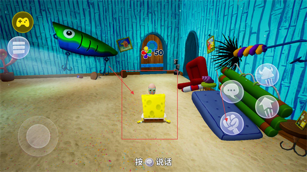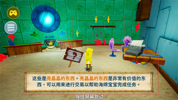 1、在海綿寶寶的房間中,通過左側搖桿控制移動,與海綿寶寶互動可觸發劇情,同時收集場景中的“亮晶晶的東西”積累資源。