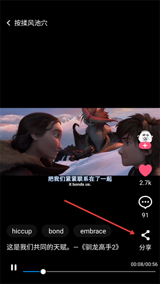 3、在視頻播放頁面,點(diǎn)擊右側(cè)的“分享”按鈕,彈出分享渠道的選擇菜單。