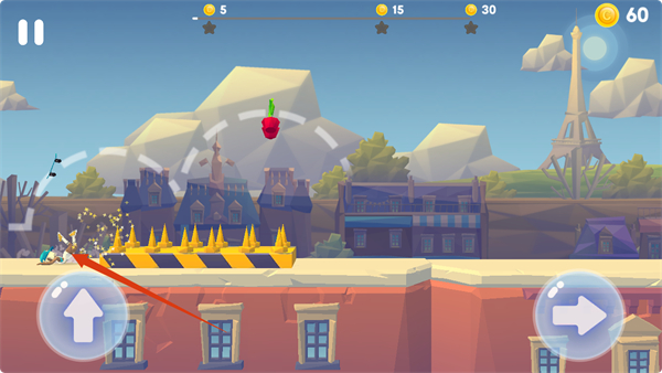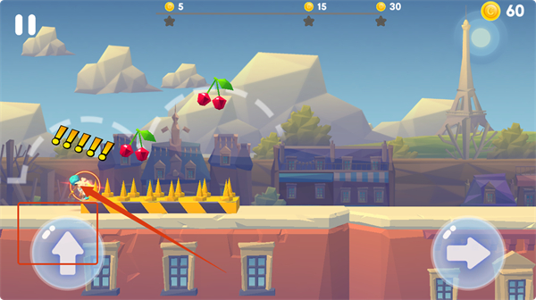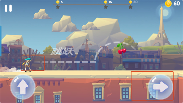 2、跑酷中,使用右側箭頭按鈕前進,左側跳躍按鈕躲避障礙,同時收集櫻桃等道具。