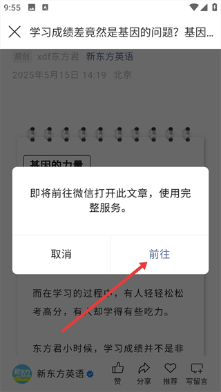 4、在分享彈窗中點擊【前往】按鈕,跳轉至微信平臺,完成該文章的分享操作。
