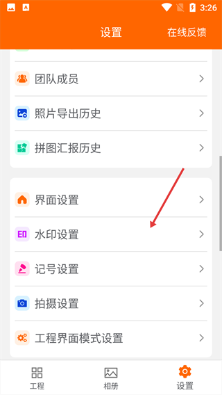2、在【設(shè)置】頁面中,找到并點(diǎn)擊【水印設(shè)置】選項(xiàng),進(jìn)入水印設(shè)置界面。