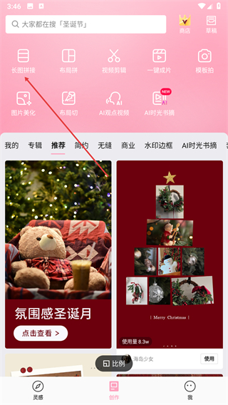 1、首先我們下載軟件之后打開進入創作界面,在這里可以看見長圖拼接、布局拼、一鍵切圖、一鍵成片等等。
