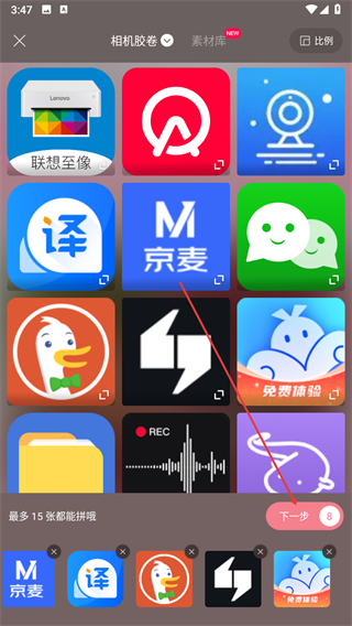 2、在相機膠卷中挑選需拼接的圖片,選好后點擊下一步按鈕。