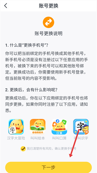 2、勾選“我已清楚所有風險,確認更換手機號”選項,點擊“下一步”繼續操作。