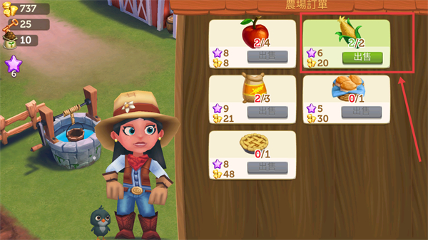 4、【玉米】數量滿足【農場訂單】要求時點擊出售按鈕,可獲得【6】星星和【20】金幣獎勵。