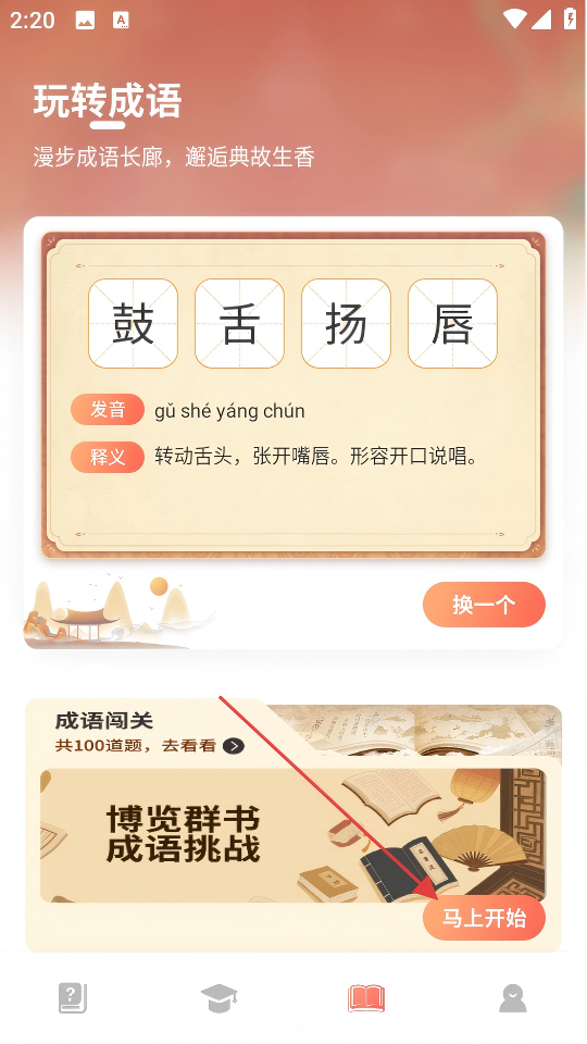 2、在首頁,點擊底部書籍圖標,進入“玩轉成語”頁面。