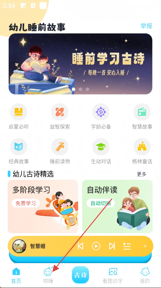 2、在首頁點擊底部【哄睡】,進入“寶寶必聽”故事分類頁面。