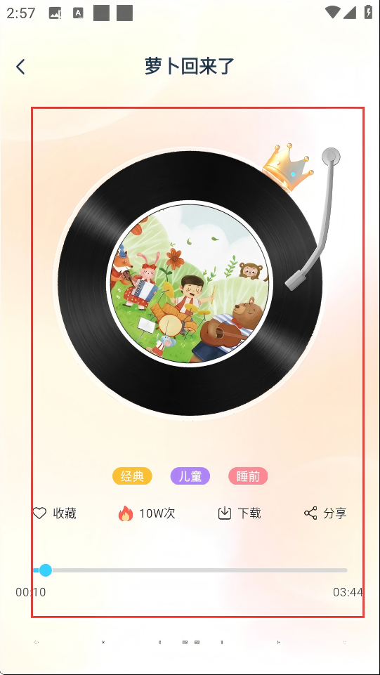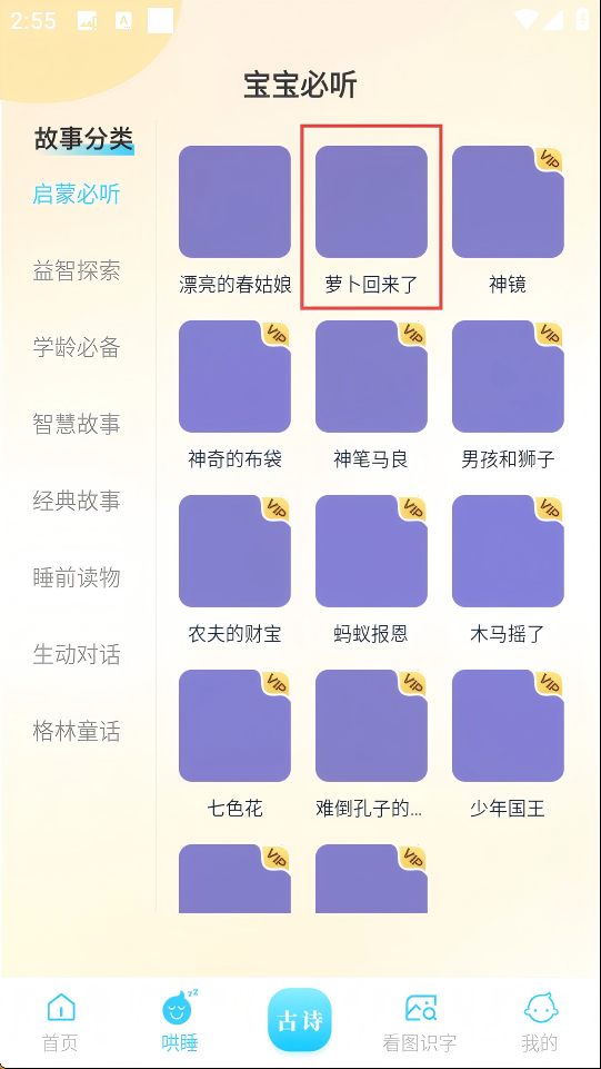 3、在“寶寶必聽”頁面,點擊故事【蘿卜回來了】,進入該故事播放頁面。