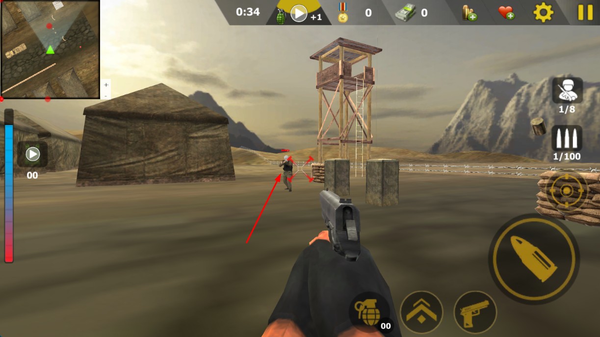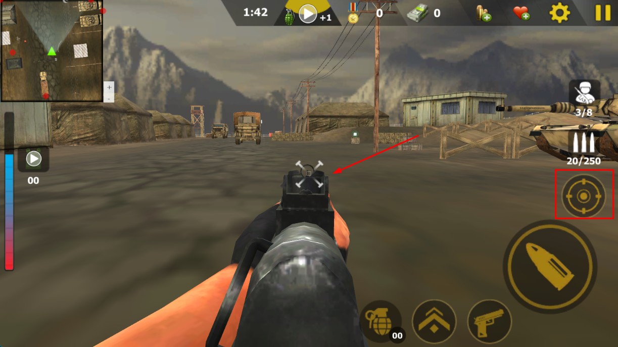 4、點(diǎn)擊右側(cè)瞄準(zhǔn)按鈕,精準(zhǔn)鎖定遠(yuǎn)處目標(biāo),提升射擊命中率,完成清剿任務(wù)。