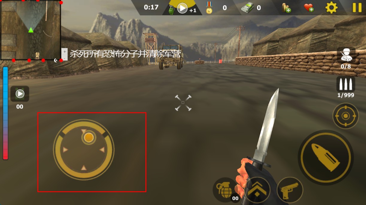 2、用左側(cè)搖桿操控角色移動,在營地場景探索,接近恐怖分子。