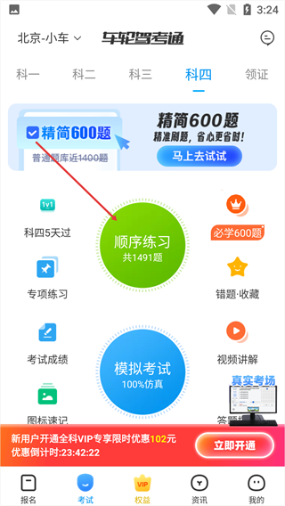 2、在考試練習(xí)頁(yè)面,選定目標(biāo)科目,點(diǎn)擊“順序練習(xí)”按鈕。