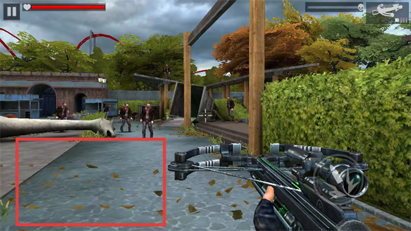 1、進入游戲場景后,觀察地面落葉區域,利用地形掩護,手持弩箭武器,準備應對前方喪尸。