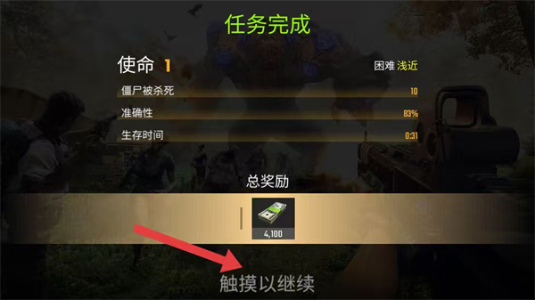 4、任務完成后,觸摸屏幕繼續,可獲得金幣獎勵,用于升級武器或解鎖新裝備,提升后續戰斗能力。