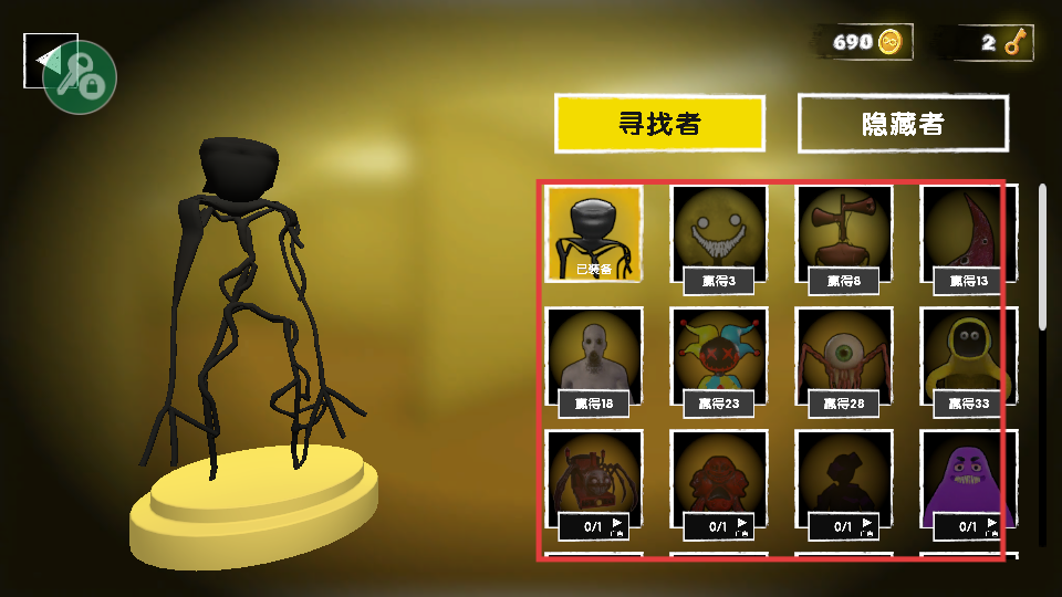 1、選擇【尋找者】角色,查看可解鎖的角色列表,為游戲選擇合適的角色形象,開啟游戲進程。