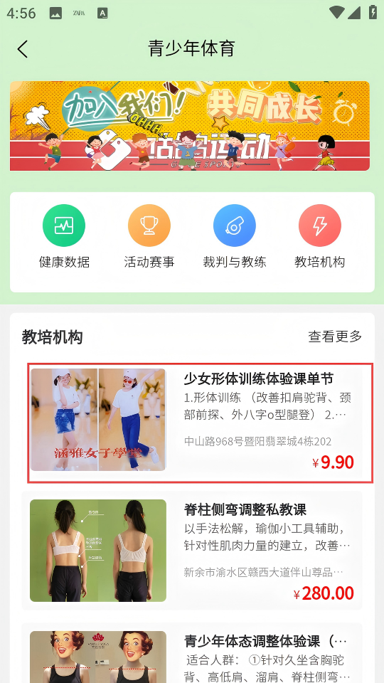 1、在首頁,點擊【青少年體育】選項,進入青少年體育頁面。