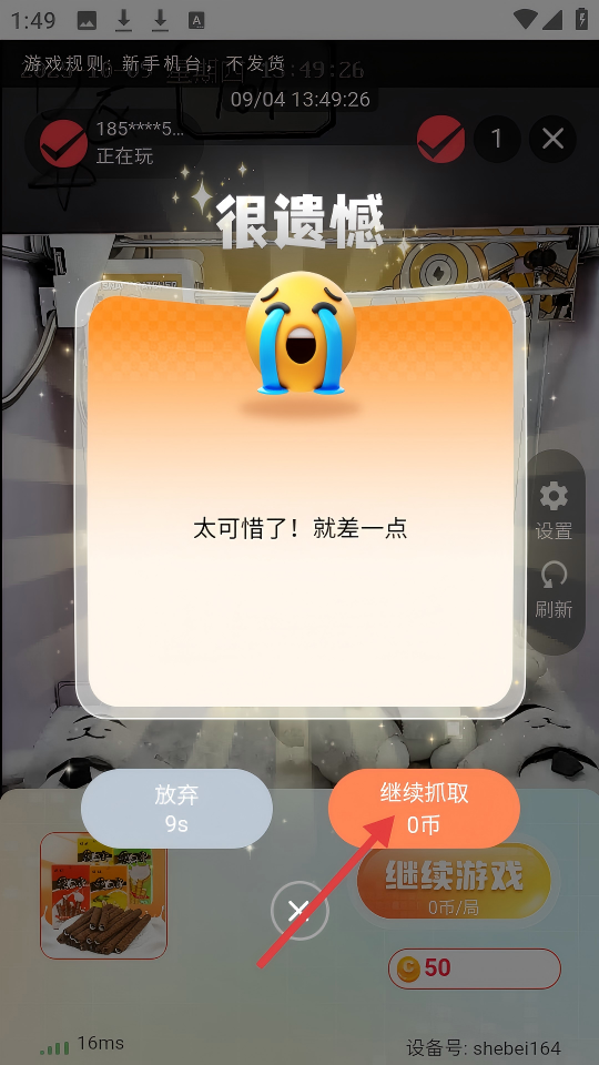 4、游戲失敗時(shí),可點(diǎn)擊【繼續(xù)抓取】按鈕,花費(fèi)0幣繼續(xù)游戲。